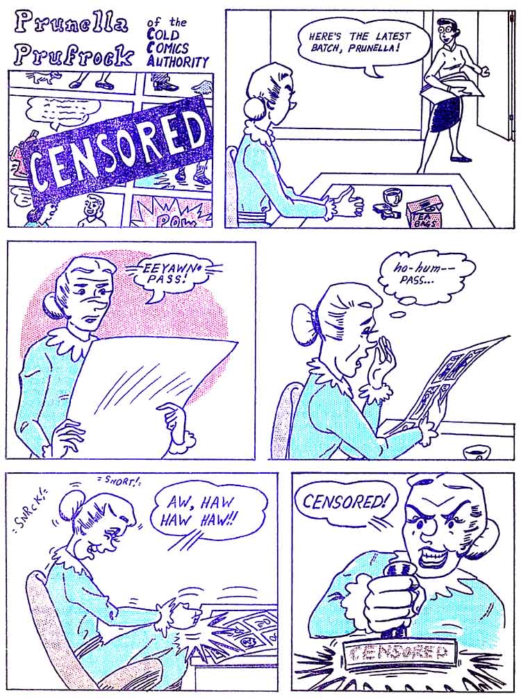 Which doesn't have much to say about Prunella. Back in the Sixties, when the Comics Code Authority was much more powerful than it is now, the head thereof was named Mrs. Trulock. I thought it'd be fun to add the existential angst of "The Love Song of J. Alfred Prufrock". And I decided to illustrate her as Mrs. Grundy from the Archie comics. "Mrs. Grundy" was the stereotypical censor-figure from the days of "banned in Boston". The Archie people reworked her as a stiff-necked teacher. And now she's come full circle ...