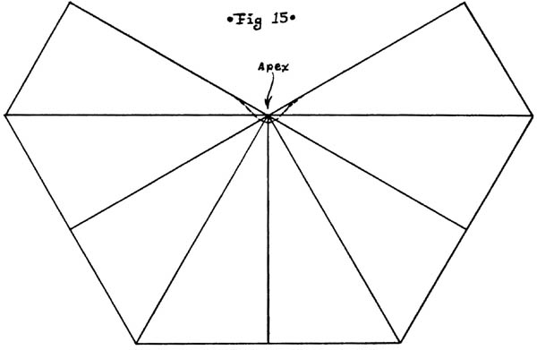 If you are assembling a circle cloak out of kites, the apex of the cloak is a real clash of seams. It is easiest to make a neck opening and avoid the apex entirely. You may be constrained by fashion to do otherwise. Fake it. Simply make a slow dip in from the edge of the cloak, so you pass the apex at a distance of an inch or two. (Fig. 15) Then proceed as in making cloaks with neck openings. You can line the cloak (it's a bit harder to hang it up to sag, but you can manage). You can use a facing. Or you can use a collar, though with this sort of cloak it ends up looking rather like lapels. A shoulder capelet does not go over well as a part of this style.