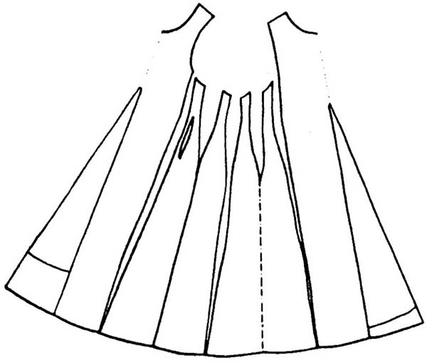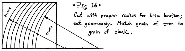 I have tried to trim cloaks such as this with ribbons, and it does not work well unless the ribbon is very narrow indeed. The curve of the hem is too strong, even in a large cloak, and the inner side of the ribbon will wrinkle up. The same problem is found if you try to use a self-fabric lining several inches up from the hem (to make it look neat until the lining proper covers things up). The answer is obvious: cut pieces of cloth with curvature to match the part of the cloak you are decorating. This can be done rather efficiently, as per fig. 16. When you want a self-lining, it is even easier. Simply make your cloak about 4" too long. When you trim it to length, you will have a 4" width of material with just the right curve lying on the floor next to the cloak itself. Turn one of the two over, and pin them together good sides facing. Sew and turn, overstitch, and blind-stitch the upper edge of the lining in place.