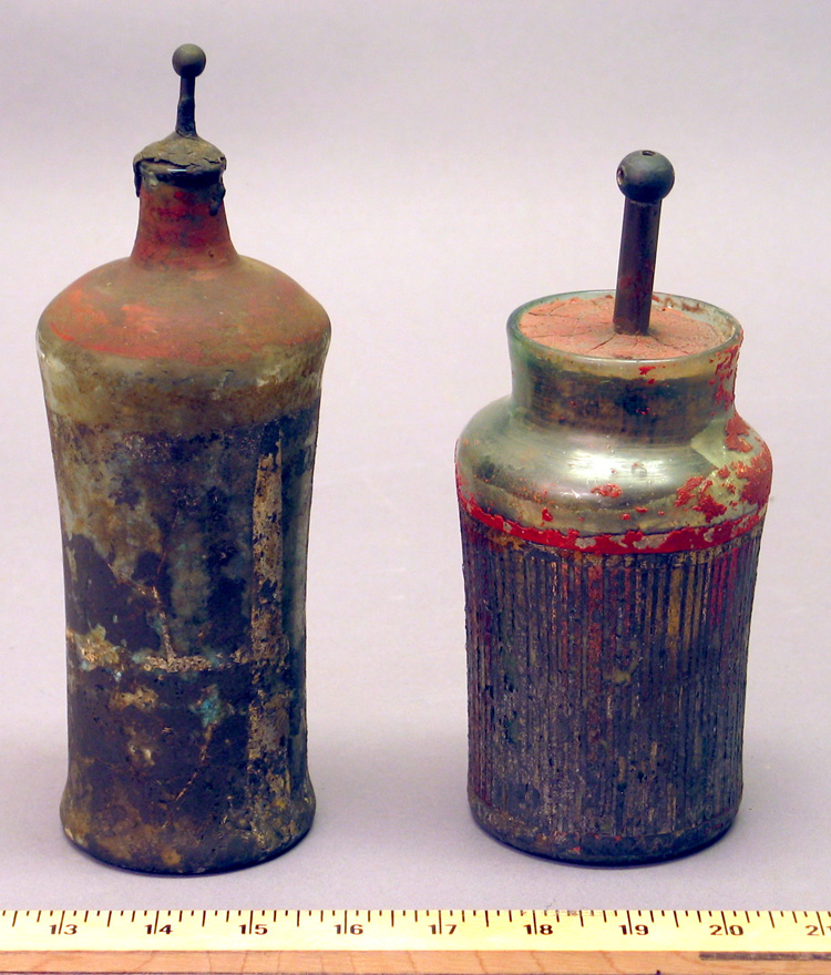 Now the insides were a different matter. It was really hard to line the bottle with tin foil. (Trust me. I make Leyden jars for museum programs. I may use aluminum tape instead of tin foil, but I know the routine.) So instead, makers would stuff the bottle full of gold leaf. It's very thin and flexible, and gold laughs at nitric acid. Both these bottles are filled with gold leaf. And it's definitely the old stuff - you can tell. Modern leaf is so thin you can't pick it up without training and special equipment. OLD leaf is thicker. This stuff is thick. (Thick is a relative word. If you crumpled all the gold in these bottles into a ball, a healthy beetle could carry it off.)