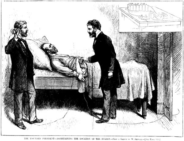 On July 2, 1881, the assassin Guiteau shot President Garfield. One bullet, especially, worried physicians; but they were afraid to probe the wound in the critically-weakened Chief Executive. Perhaps an induction balance could be used to find the bullet in Garfield's body, so surgeons could remove it? (3)