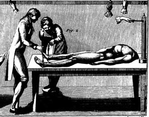 "Galvanism had given token of such things" indeed. Jean Aldini, Galvani's nephew, was famous in this sense. In the London of 1802, he experimented upon the cadavers of executed criminals. He found they retained muscular irritability for two hours, and that he could excite many of the motions of life by application of current from a Voltaic Pile. While Aldini wrote a sober and scientific book on Galvanism and its uses, he nonetheless suffered the gibes of satirists. One anonymous poem said: