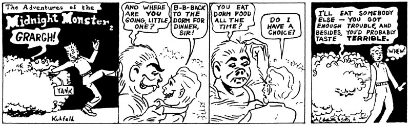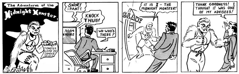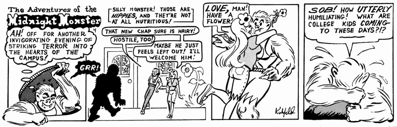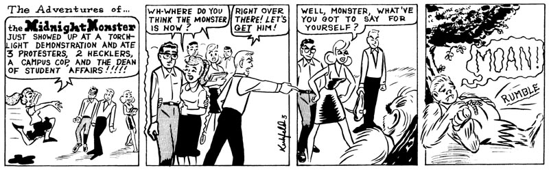 Once upon a time, in the 1960s, I was a student at the University of Minnesota. (See one of the places I worked. When the bridge over the Mississippi river went down, it landed about ten feet in front of the door of the lab. Fortunately, I hadn't been there for years.) I was also a comicfan, and wanted to draw. So I got a niche with the Minnesota Daily as an occasional editorial cartoonist. This was the era of the Vietnam War, the hippie, and the underground comic. I'll not bother showing you the Viet-toons, but here's a comic strip I hoped to get in the school paper: