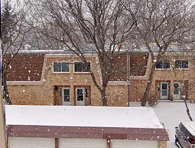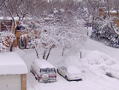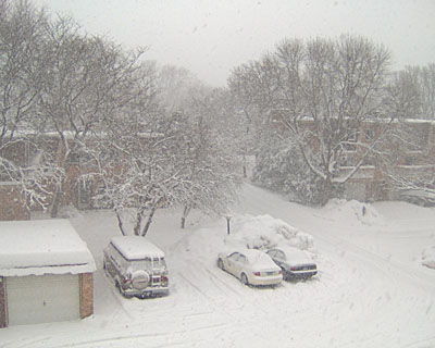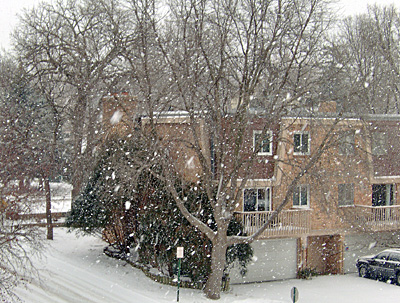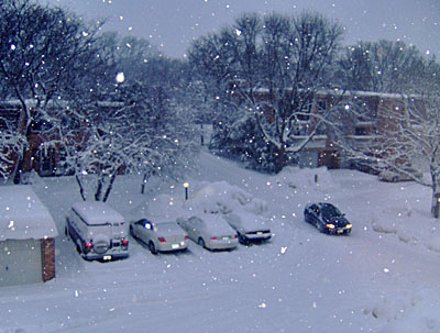We had our first serious snowfall of the Winter last weekend. Oh, we've had some decent snows, a couple incidents of really unsettling frreezing-rain/sleet, and some real cold (down to -20 F or so, about -30 C) but this is the first snowfall that made a serious attempt to cover us up and slow us down. I haven't used a ruler myself, but the weather shows said something on the order of 8 inches (20 cm). I had a fine, quiet day at home with the computer, the cats, the internet, the spouse, and a nice mug of hot chocolate.