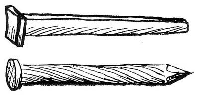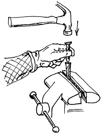 Since these nails are very hard steel, a normal hardened hammer can slip off. Strike them with a soft hammer - a rawhide mallet, a plastic-faced hammer, or even a brass hammer.