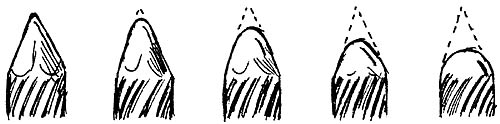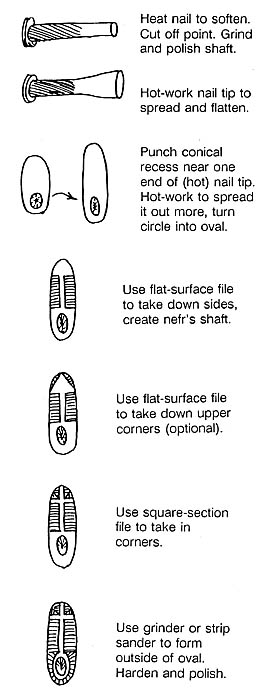 When we have a satisfactory recess in the center of a straight-shafted nail, clean up the details. Flatten the tip of the nail so it meets the grinder or strip-sander at right angles. Now, using the same grip as for grinding our chasing tools, grind symmetrical shoulders around that recess - sharpened or rounded, depending on the effect we want. Polish and harden.
