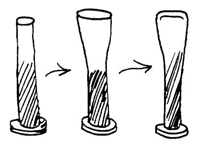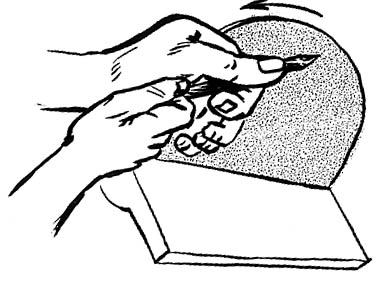 Most of these may be ground with the same hand technique as punches. Since we're removing more metal, the grindstone will generate more heat; dip the tool in cool water frequently. Always wear eye protection while doing this - but it's good discipline to use bare hands. That way we know when the metal is getting too hot.