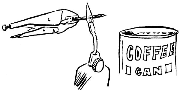 To harden the nail up again, take a metal can full of cold water. (Otherwise, we could end up with a wet floor. Hot metal can melt a plastic bucket before it cools.) Heat the nail red-hot, then plunge it into the water. Polish to a bright surface.